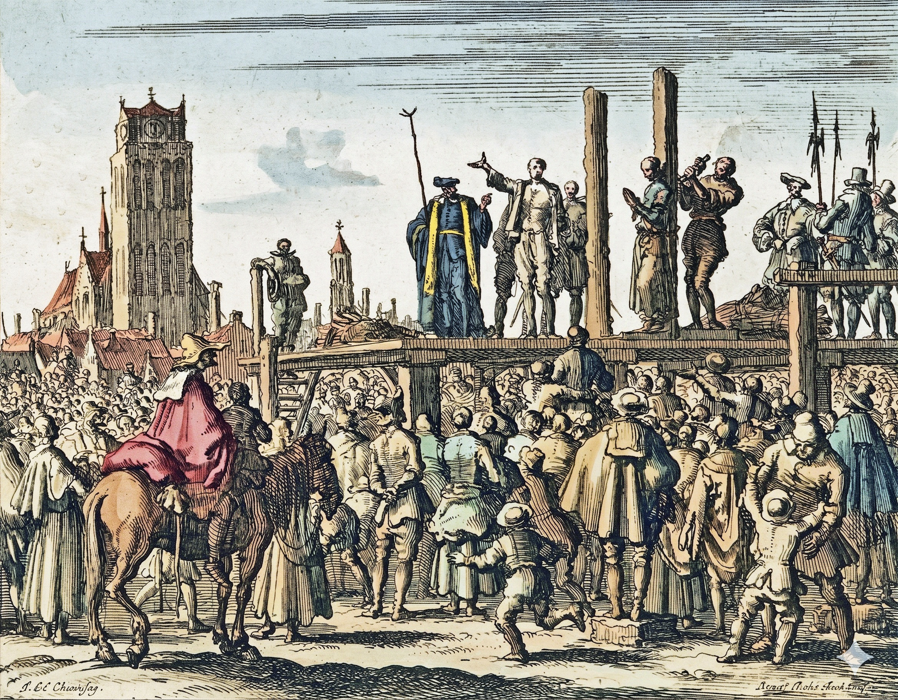 Jan Woutersz van Kuyk en Adriaantje Jans werden in het openbaar in Dordrecht verbrand. Dit gebeurde in opdracht van de Spanjaarden wegens zogenaamde ketterij omdat zij protestant waren. Adriaantje werd vooraf gewurgd omdat ze een vrouw was. Jan moest de verbranding levend ondergaan. Gravure door Jan Luyken in 1685, later ingekleurd.